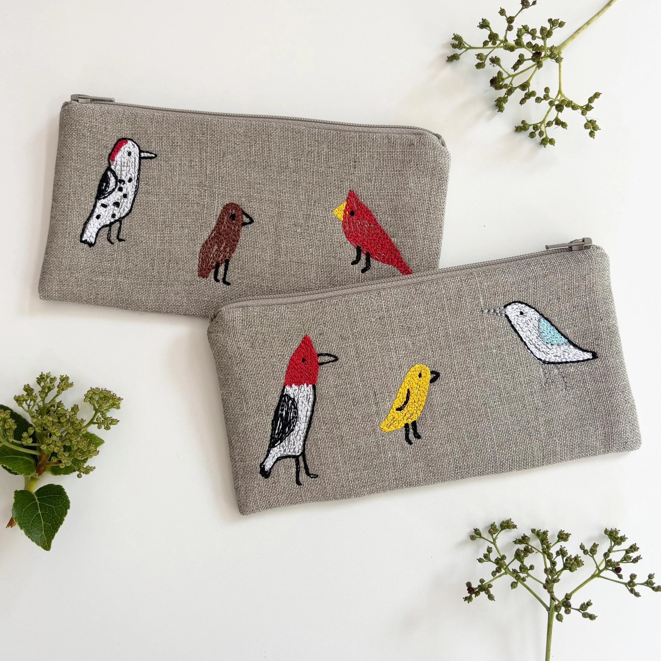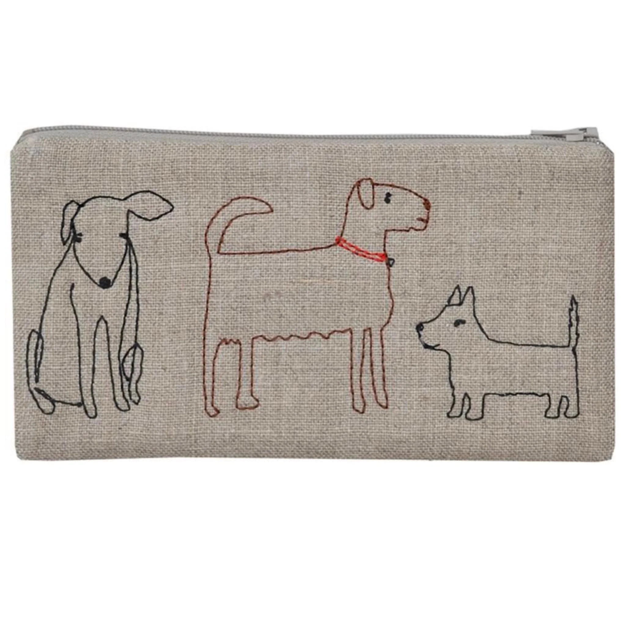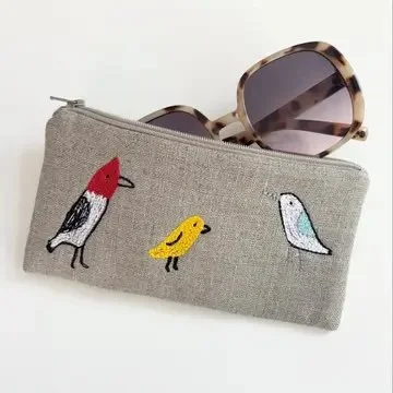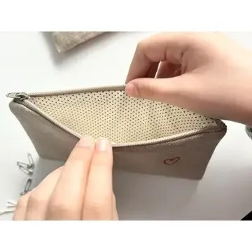 Natural flax linen with multi stitch on both sides. Zipper pouch is quilted with cotton batting and lined with dotted fabric.